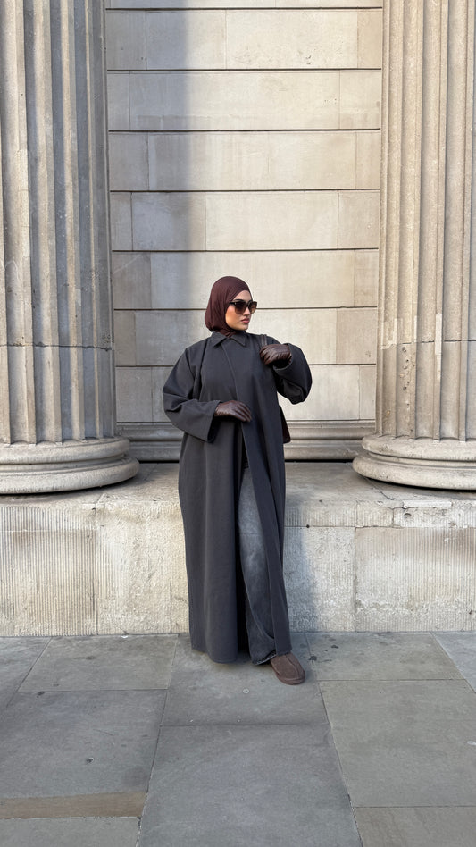 Assymetrical shirt collar winter abaya in charcoal stripes