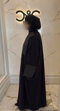 This open abaya features three discreet buttons, allowing you to style it open or closed with ease. The design includes an attached scarf, creating a cohesive, polished look while offering exceptional versatility. The scarf can also be used as a nursing cover, making this abaya an ideal choice for mothers and expecting women, without compromising on style or modesty.