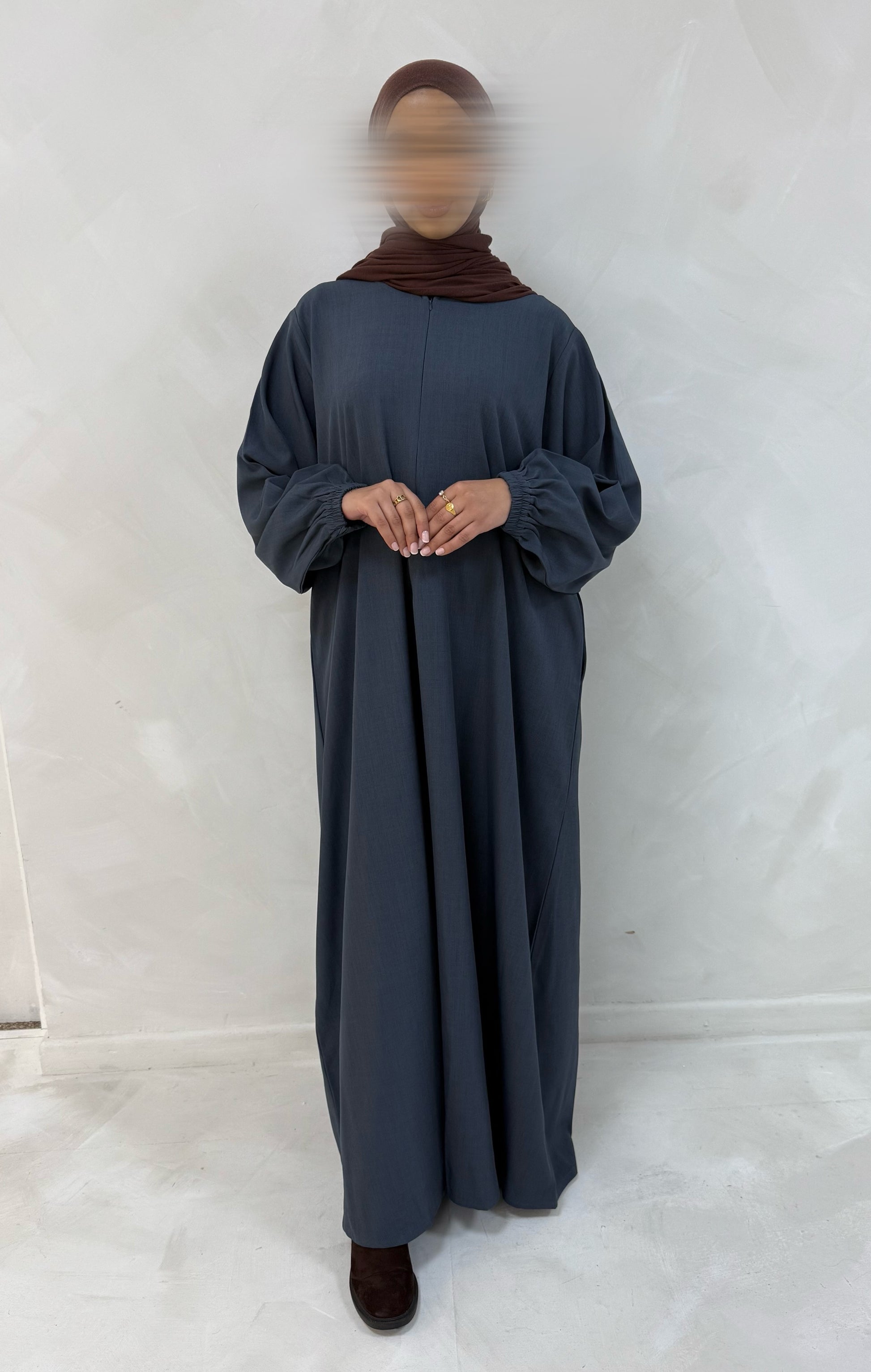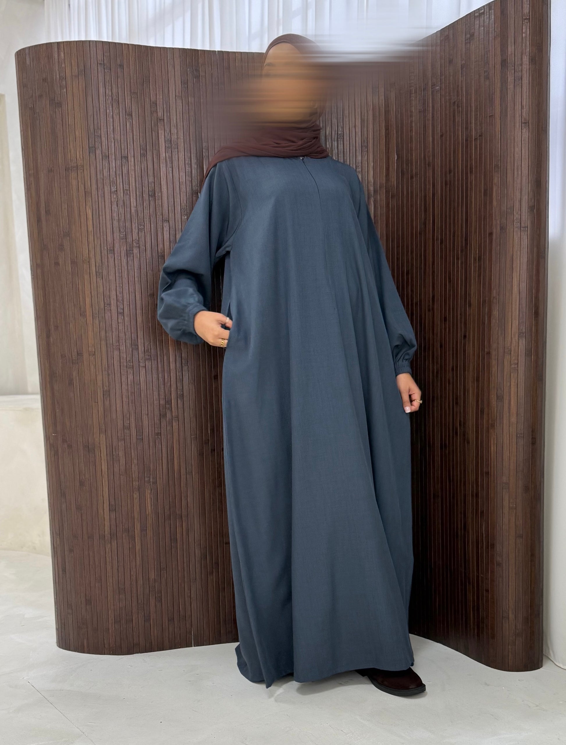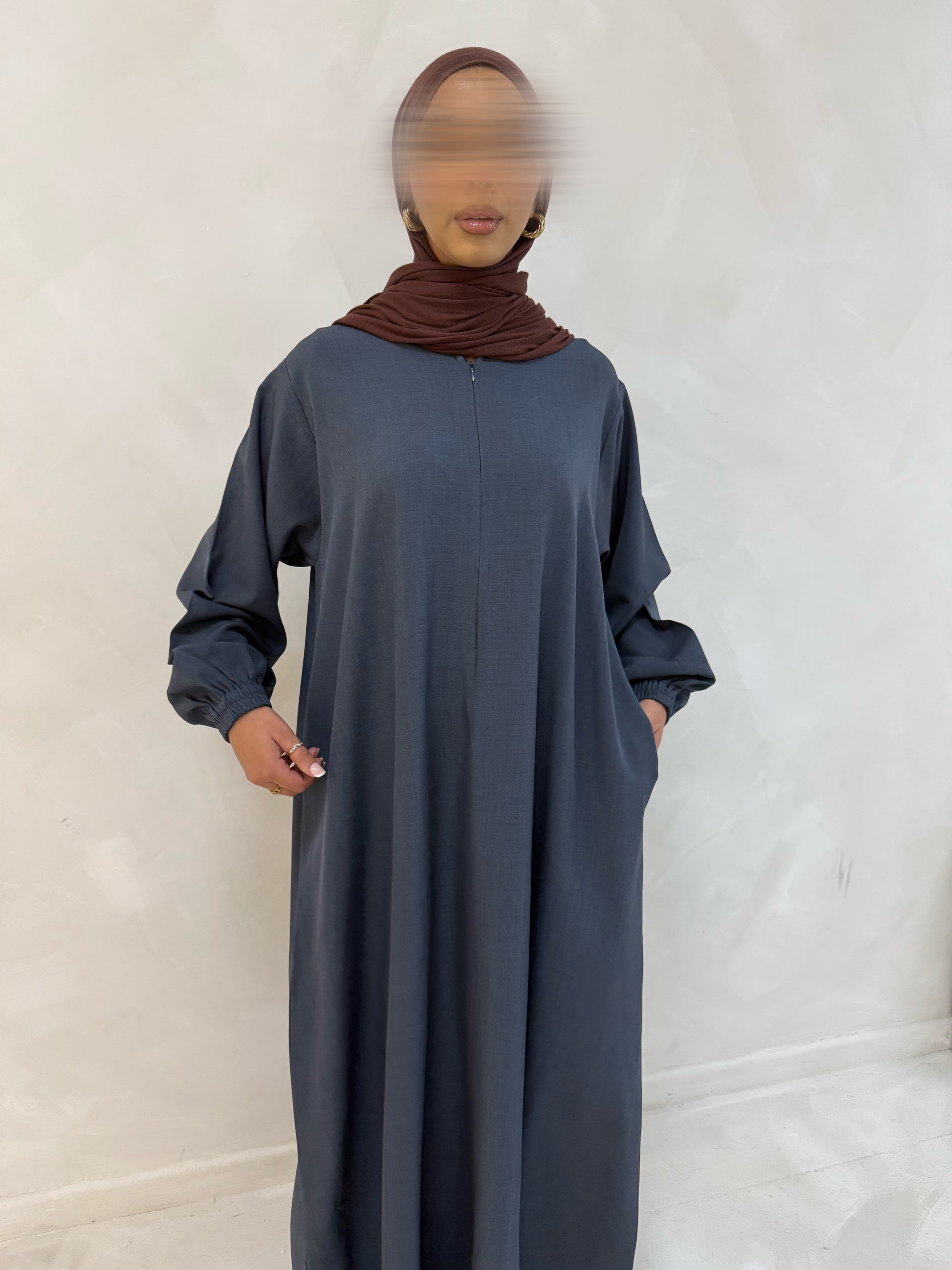 Stay comfortable and stylish with our Lina nursingfriendly abaya in a denim blue/grey colour.
