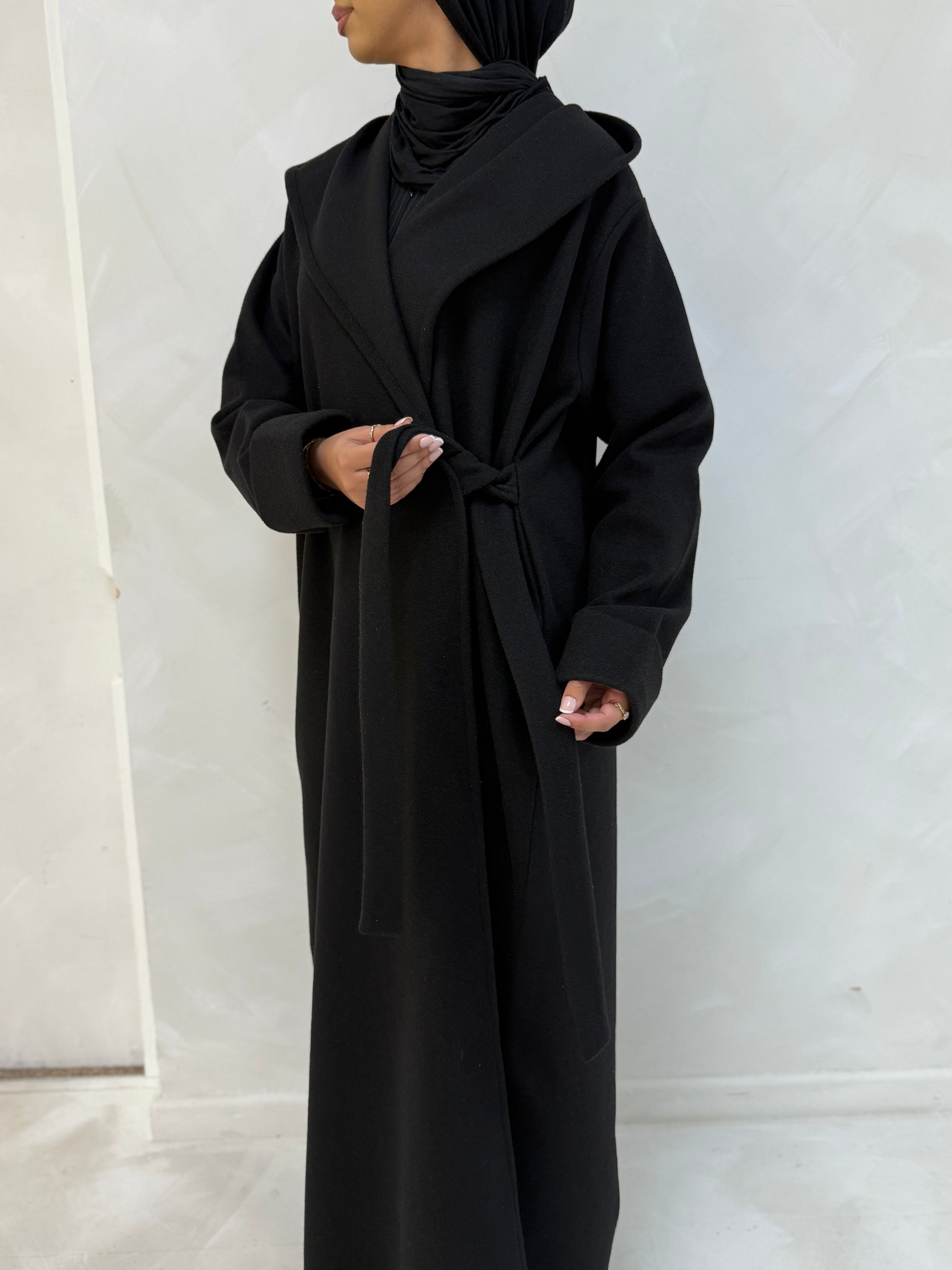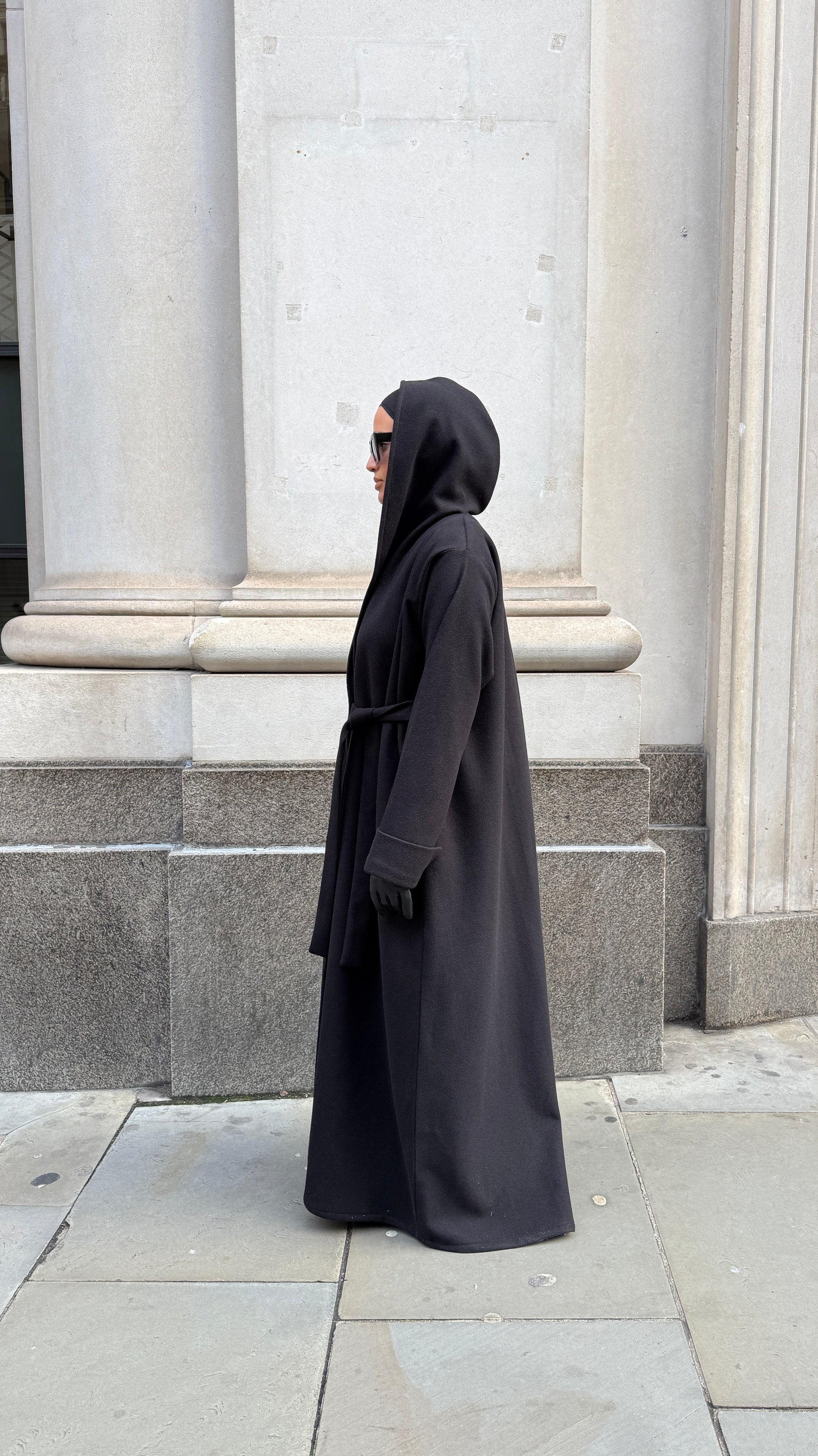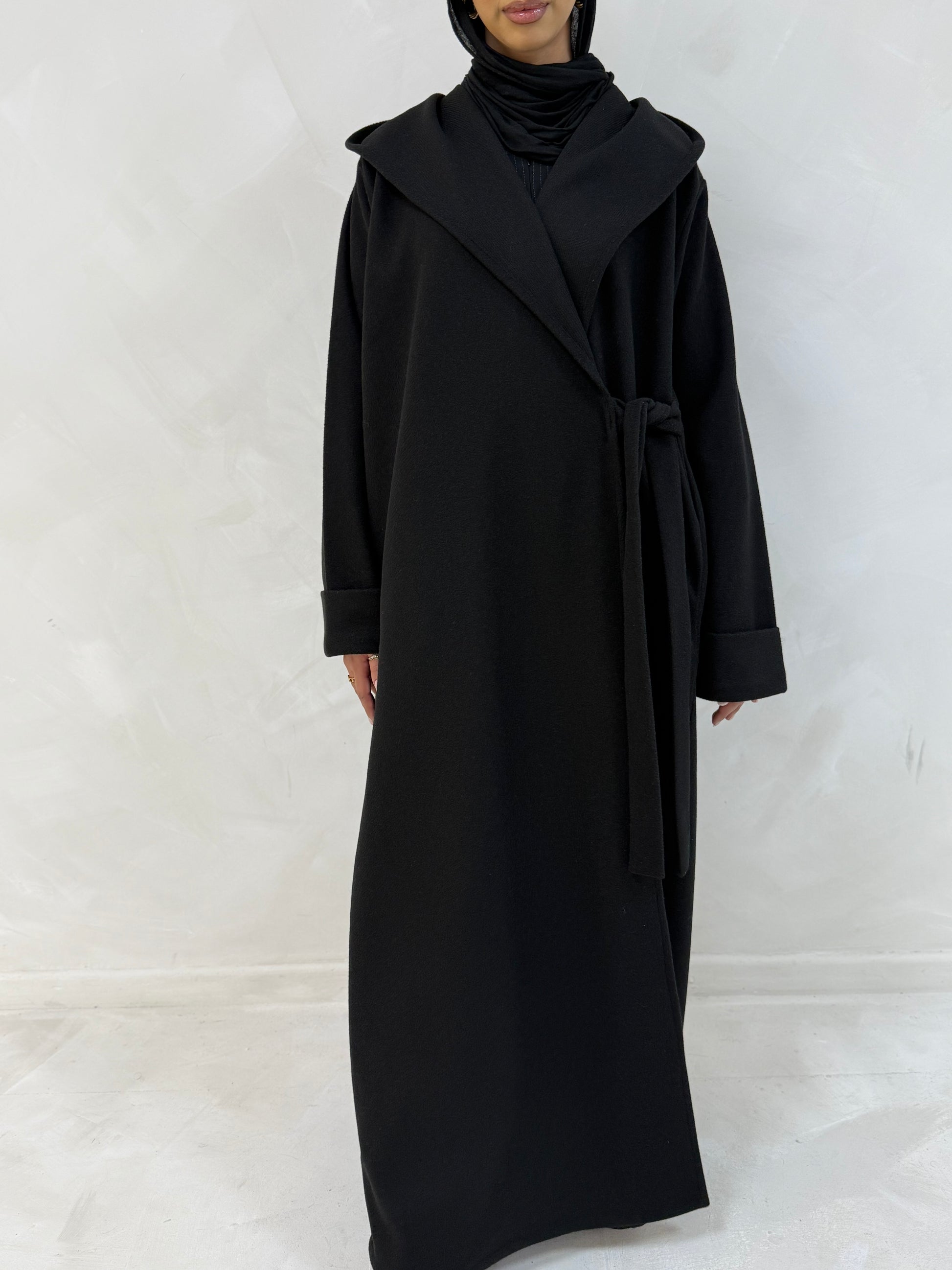 Hooded Wool-Blend Winter Abaya with Pockets & Side Tie
